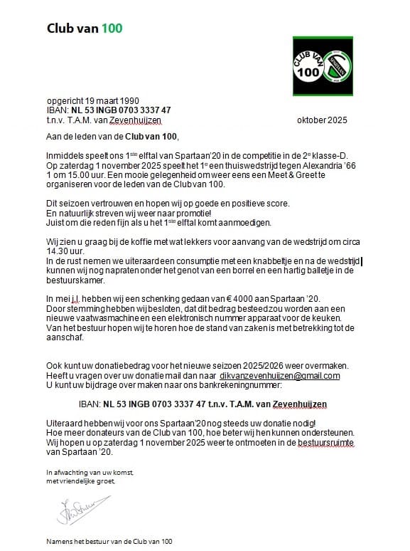 Het bestuur van de Club-Van-100 heeft onderstaande brief aan haar leden gestuurd. Omdat een kopie niet altijd leesbaar is op een scherm(pje) even een :
