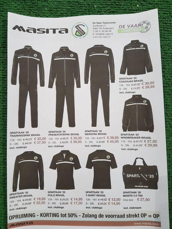 SPARTAAN’20 KLEDING BIJ ‘DE VAAN’ IN DE SALE ! In juli 2018 komt de nieuwe Spartaan’20-collectie uit. Om ruimte te maken voor de nieuwe collectie gaat de huidige Spartaan’20-collectie in de uitverkoop met kortingen tot wel 50% ! Wees er snel bij want OP=OP ! Zelf een extra trainingspak of jack nodig, kom dan snel…