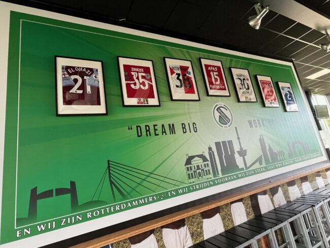 Het is u ongetwijfeld al opgevallen. De wand in de kantine tegenover de bar heeft een nieuwe aankleding gekregen. Sinds de opening in 2012 van ons gebouw hing daar het kunstwerk met fotocollage van mooie beelden uit de historie van de club. Maar…nieuwe tijden, nieuwe ideeën! De wand heeft een nieuwe aankleding gekregen: de ingelijste…