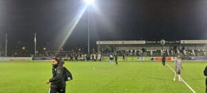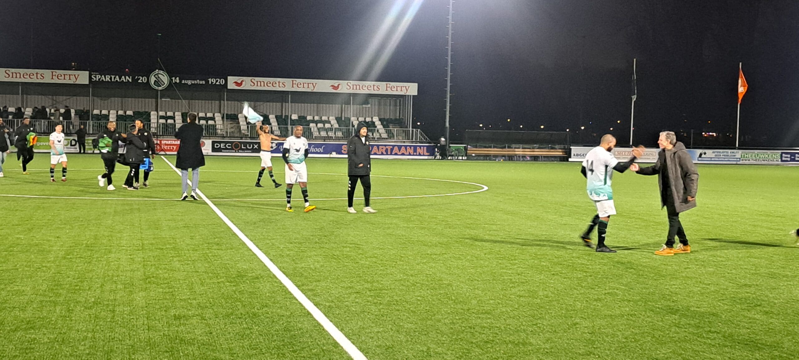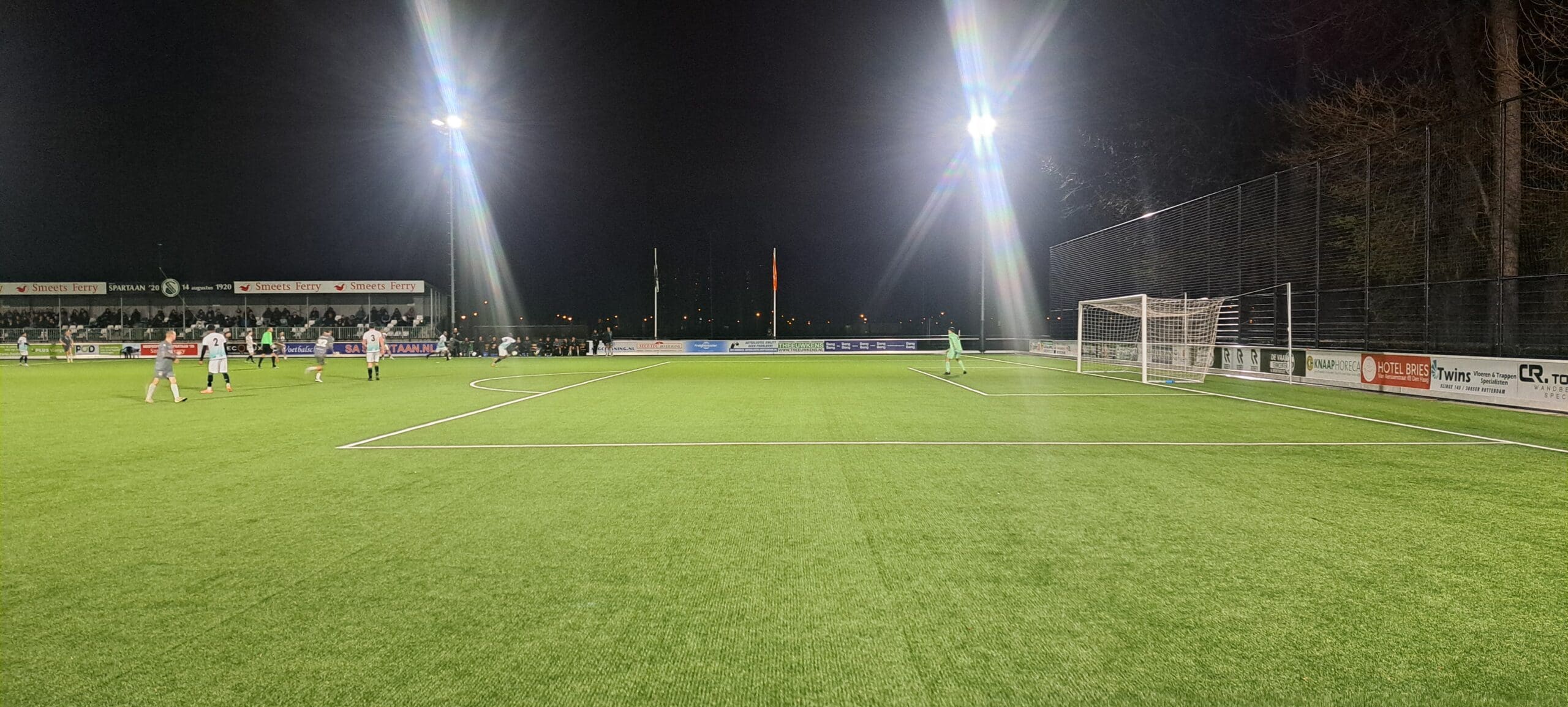 De 1/8 finale van de beker tegen SJC uit Noordwijk, twee klassen hoger spelend dus, maar daar is vanavond weinig van te merken. Al vanaf de aftrap is het duidelijk dat Spartaan’20 er vol voor wil gaan. Met een prima veldbezetting en spelopvatting wordt er geweldig gevoetbald. Al in de 8e minuut is er een prachtige pass van Shayron Curiel op Danielson Vieira de Pina. ‘Dani’ gaat niet voor eigen succes, maar tikt de bal prima breed op David Widarto. De middenvelder schiet beheerst de 1-0 binnen, wat een meevaller zo vroeg in de wedstrijd.