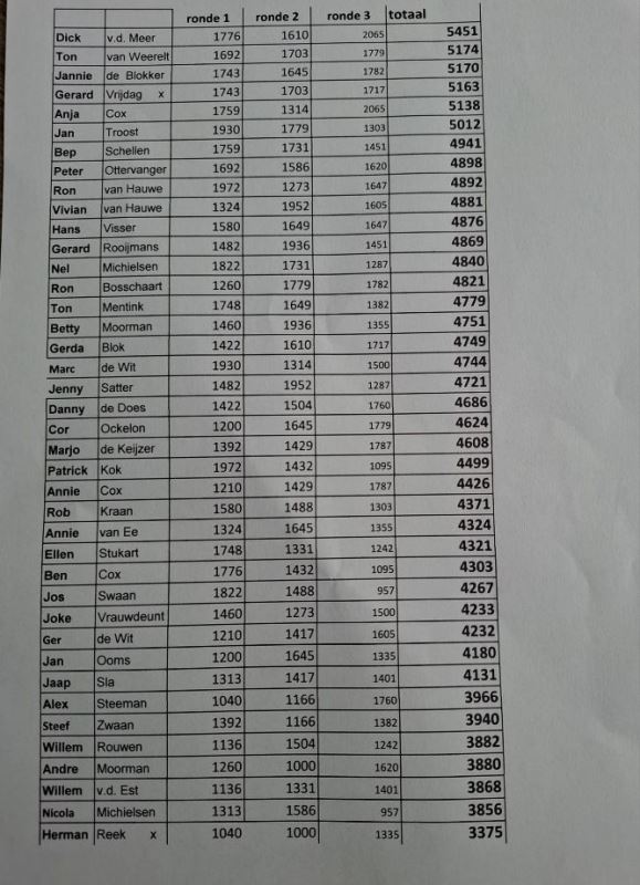 De uitslag van het klaverjassen op donderdag 6 november wordt u hierbij per afbeelding aangeboden. Dick van der Meer (5451 punten) nam ruim afstand van de rest van het veld. Tweede werd Ton van Weerelt (5174) die zich stiekem tussen het rijtje kanshebbers voor een dagzege heeft gewurmd.